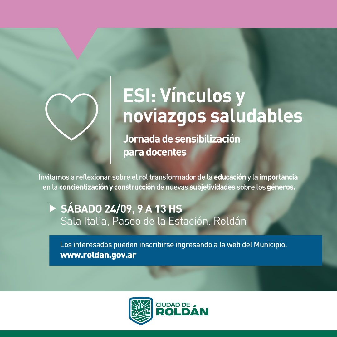 El Área de Género, Igualdad, Diversidad, Niñez y Familia, de la Secretaría de Desarrollo Social de Roldán, realizará una Jornada de Sensibilización para docentes denominada “ESI: vínculos y noviazgos saludables”, que tendrá lugar el sábado 24 de septiembre, de 9 a 13, en Sala Italia (Pellegrini al 600 – Paseo de la Estación).