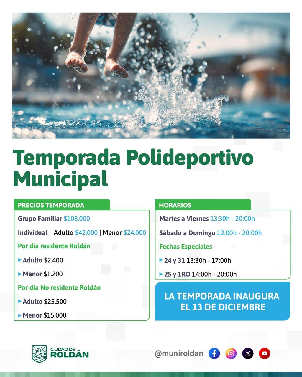 La Municipalidad de Roldán, a través de la Secretaría de Cultura, Educación, Turismo y Deporte, informa que el próximo 13 de diciembre quedará inaugurada la Temporada 2026 del Polideportivo Municipal, dando inicio a una nueva propuesta recreativa para que, roldanenses y visitantes, disfruten del verano en la ciudad.
