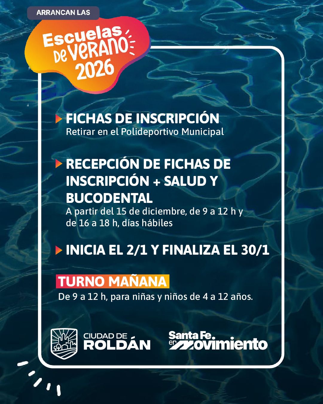 La Municipalidad de Roldán en trabajo conjunto con el Ministerio de Educación y el Ministerio de Igualdad y Desarrollo Humano del Gobierno de la Provincia de Santa Fe, invita a las familias de la ciudad a participar de una nueva edición de las Escuelas de Verano 2026, una propuesta pensada para disfrutar el verano con actividades recreativas, deportivas y educativas, en un espacio de encuentro y cuidado.