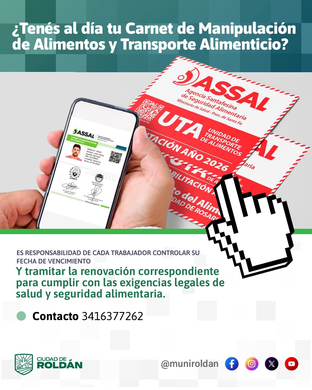 El Área de Bromatología de la Municipalidad de Roldán recuerda a los manipuladores de alimentos que el Carnet de Manipulador de Alimentos (ASSAL) debe encontrarse vigente de manera obligatoria, conforme a la normativa sanitaria vigente.