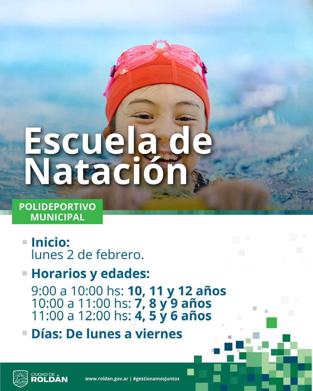 La Municipalidad de Roldán invita a la comunidad a participar de la Escuela de Natación que dará inicio el lunes 2 de febrero en el Polideportivo Municipal, destinada a niños y niñas de 4 a 12 años.