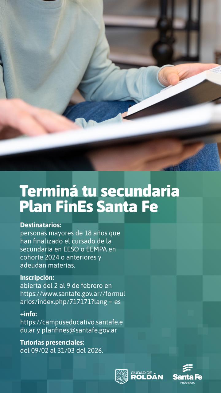 La Municipalidad de Roldán informa que se encuentran abiertas las inscripciones al “Plan FinEs 2026”, un programa educativo destinado a personas mayores de 18 años que hayan finalizado el cursado en escuelas secundarias de la provincia de Santa Fe y aún tengan materias pendientes, con el objetivo de completar sus estudios y obtener el título secundario.
